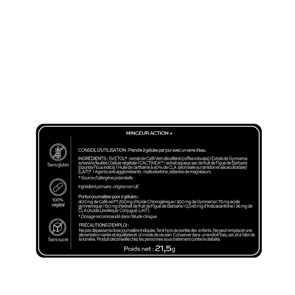 400 mg de Café vert*(***) I 200mg d’Acide Chlorogénique I 300 mg de Gymnema(***) I 75 mg acide gymnemique I 150 mg d’extrait de fruit de Figue de Barbarie(***) I 0,045 mg d’Indicaxanthine I 36 mg de CLA (***)(LAIT)**(Acide Linoléique Conjugué).