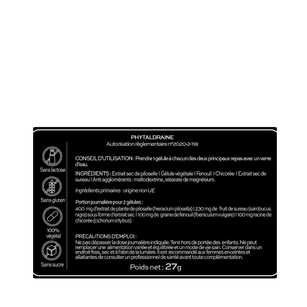 Prendre 1 gélule de Phytaldraine à chacun des deux principaux repas avec un verre d’eau.
