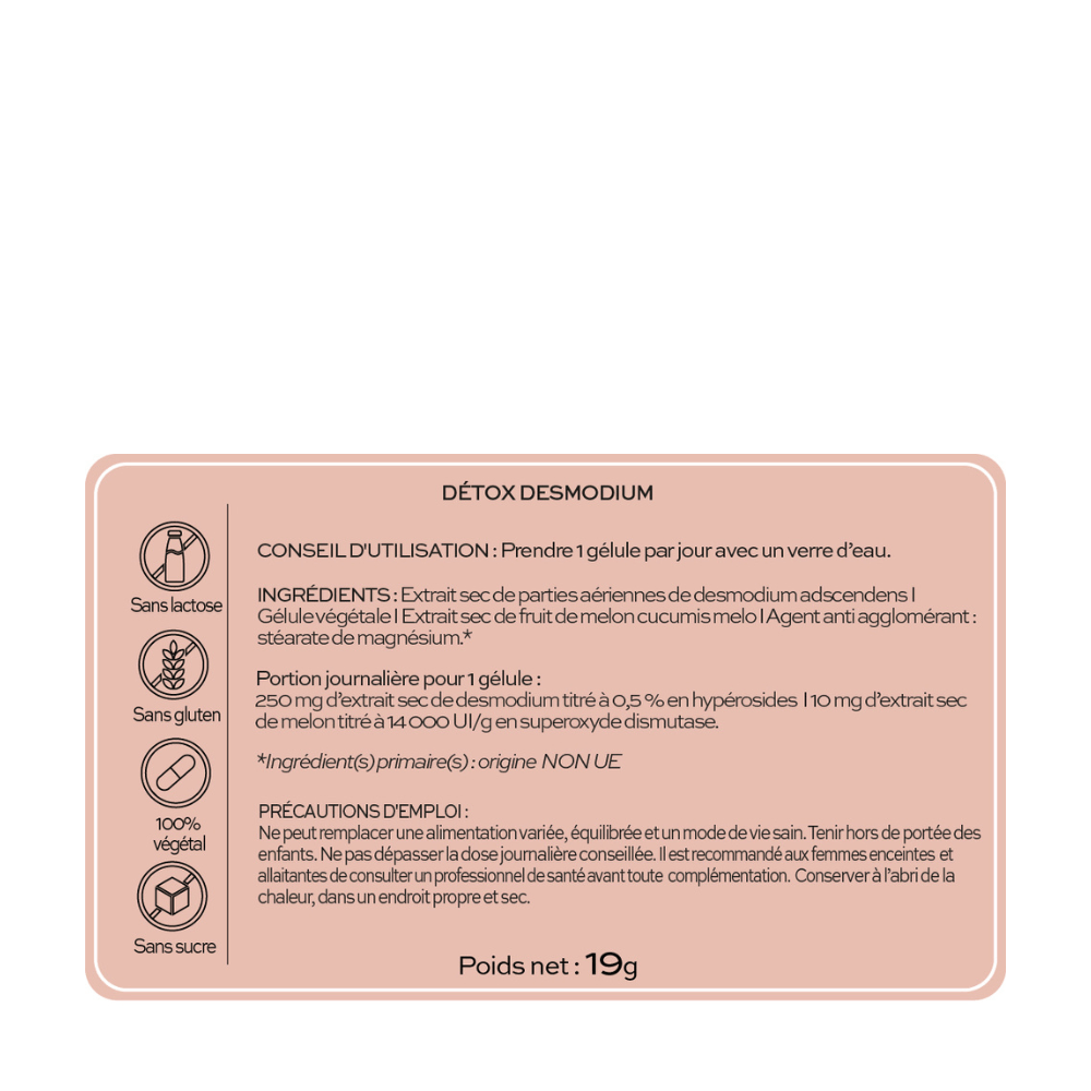 250 mg d’extrait sec de Desmodium* titré à  0,5 % en hypérosides, 10 mg d’extrait sec de Melon Amer* titré à 14 000 UI/g en superoxyde dismutase.