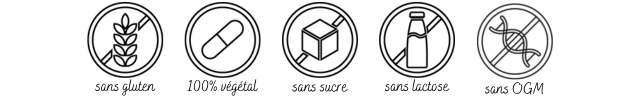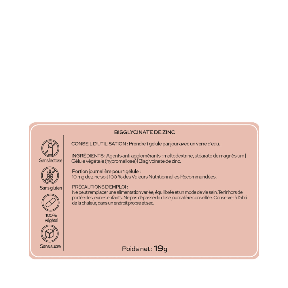 - Flacon Zinc : agents anti agglomérants : maltodextrine, stéarate de magnésium, gélule végétale (hypromellose), bisglycinate de zinc.