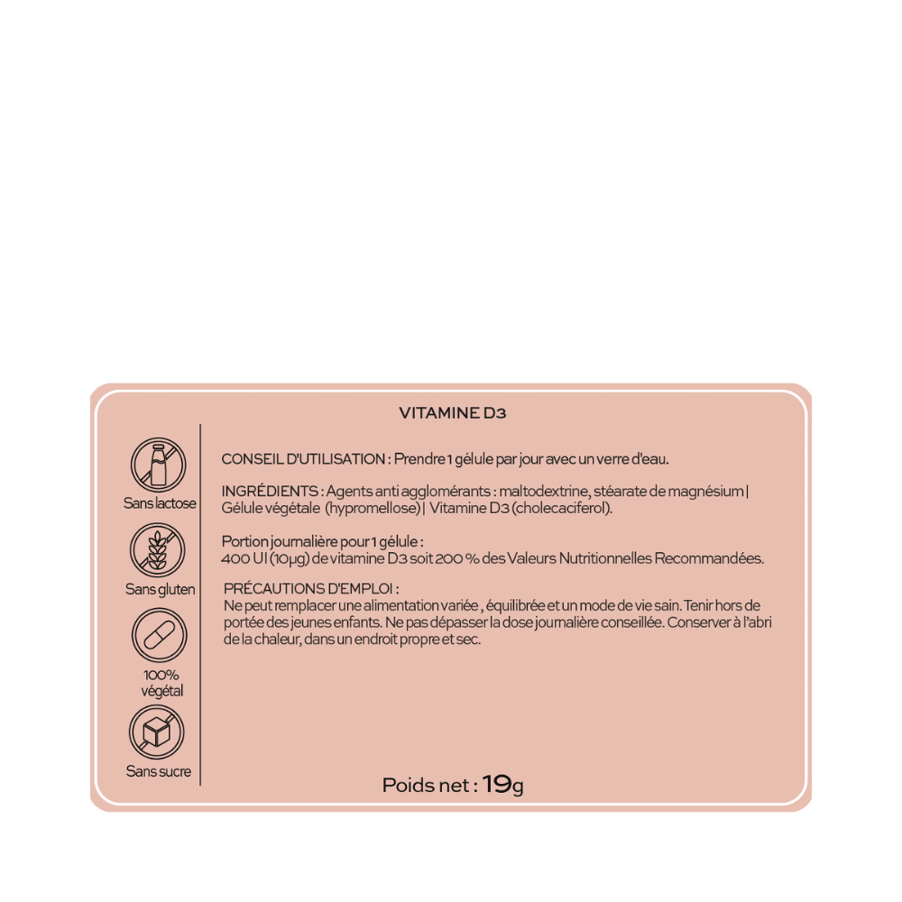 - Flacon Vitamine D3 : agents anti agglomérants : maltodextrine, stéarate de magnésium, gélule végétale (hypromellose), vitamine D3 (cholecalciferol).