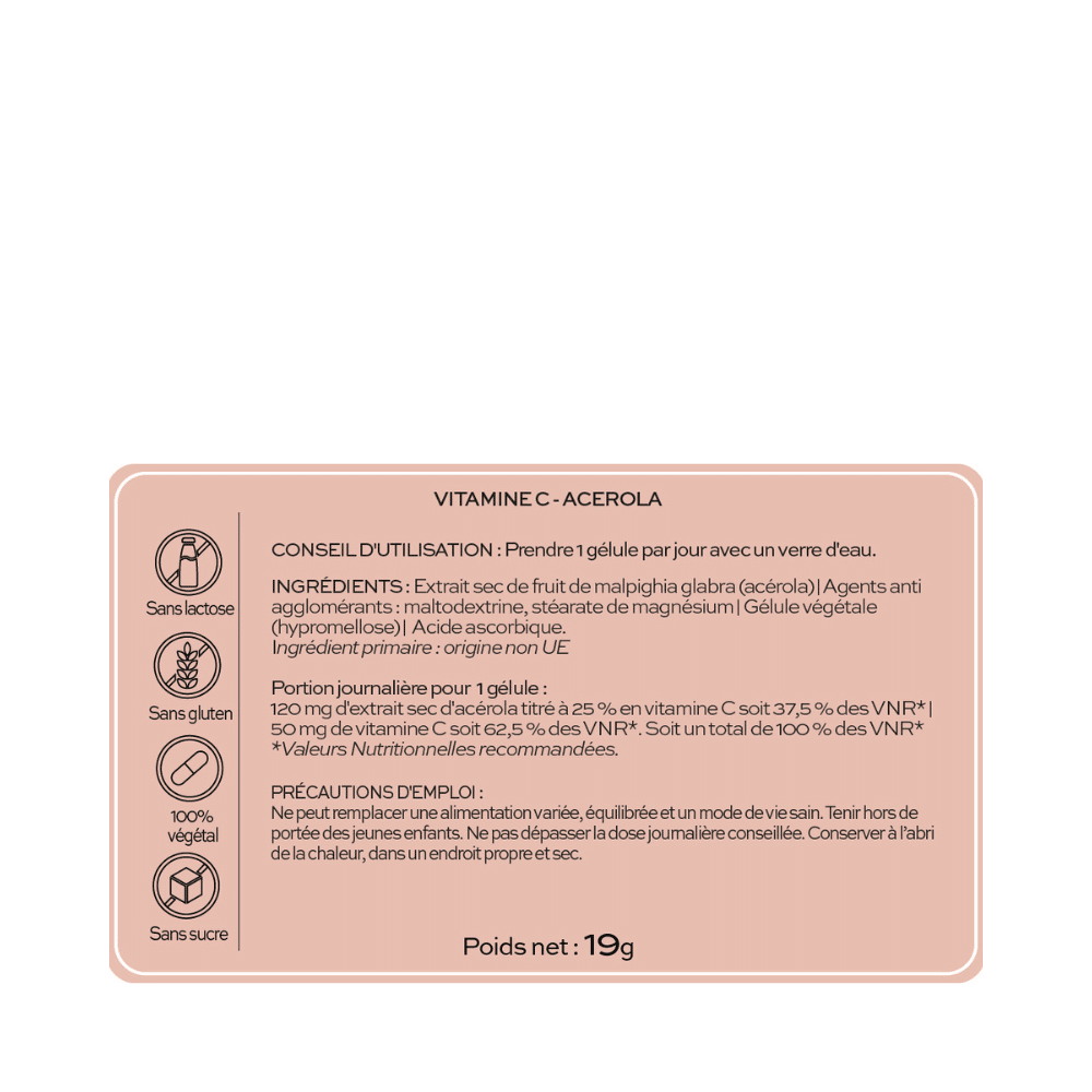 - Flacon Vitamine C : 120 mg d’extrait sec d’acérola titré à 25 % en vitamine C soit 37,5 % des VNR*, 50 mg de vitamine C soit 62,5 % des VNR* (soit un total de 100% des VNR)*